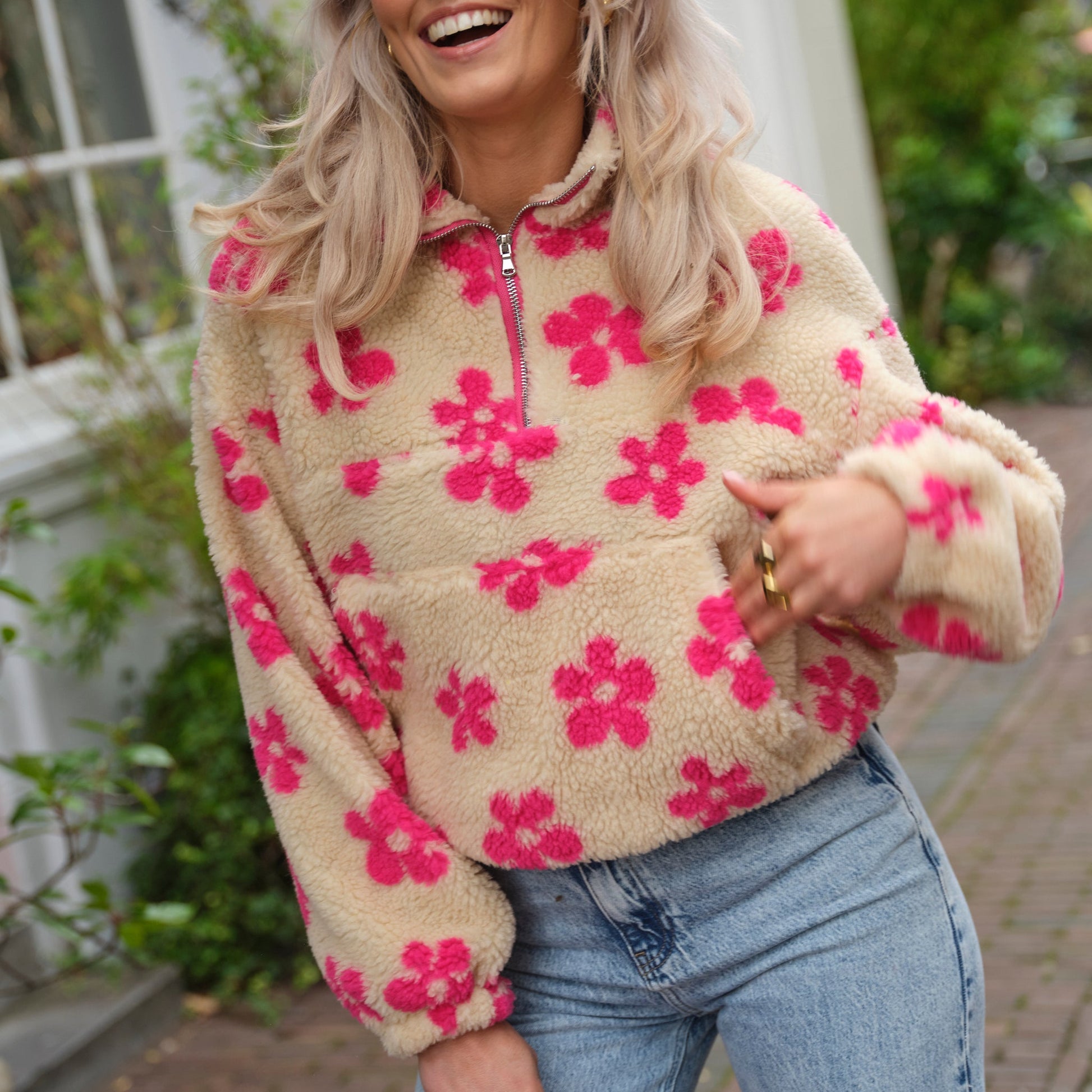 Made from ultra-soft cream-colored teddy fleece and adorned with bright pink floral patterns, this sweater brings a cheerful touch to cold winter days.